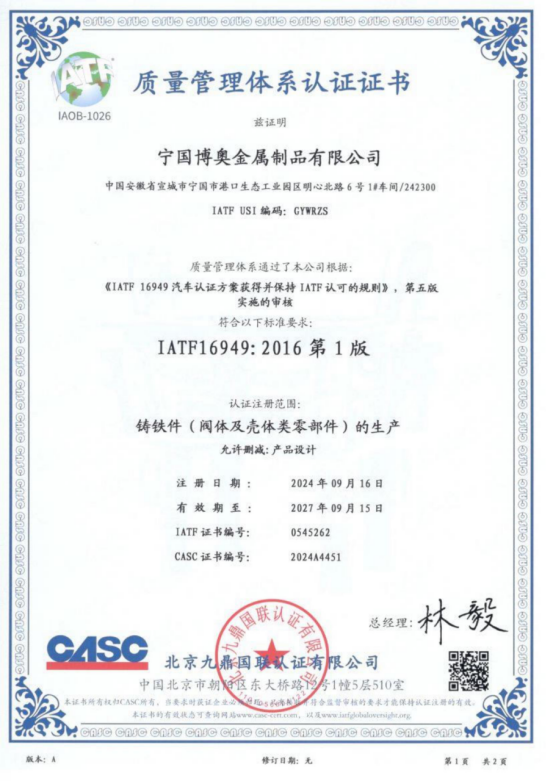 作为一家专注于提升产品质量和满足客户需求的铸造企业,凯仕铁及旗下子公司已完成了ISO9001体系的认证,并在此基础上不断优化,获得了IATF16949的体系认证,为与汽车行业客户的合作减少了障碍。